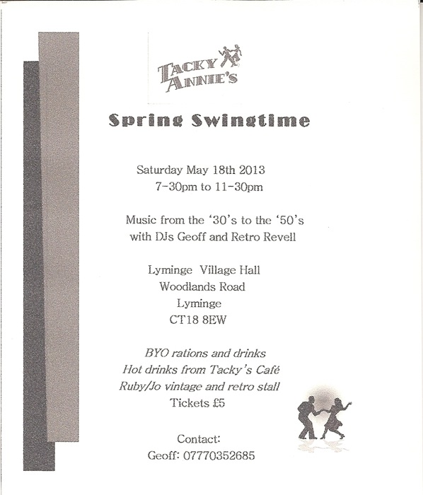 Tacky Annie’s next dance will be held on May 18th at Lyminge Village Hall from 7-30 to 11-30pm. As usual DJ’s Geoff and Retro Revell will be playing some great dance tracks from the 1930’s to the 1950’s.